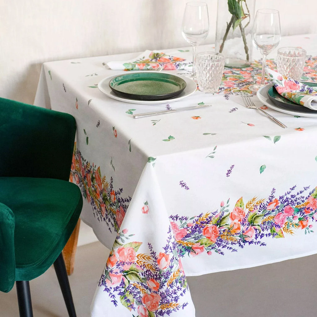 Grasseis known worldwide for it’s exquisite perfumes.The Grasse line byTissus Tosellifeatures roses and lavender, the basic ingredients to many of the wonderful scents of Grasse. This white background tablecloth is 100% cotton, coated with acrylicto makeit stain resistant and long lasting. Spills will not go through, protecting your table.Cleanup is as easy as wiping it with a sponge. UV resistant, they resist fadingand are perfect inside or outside.