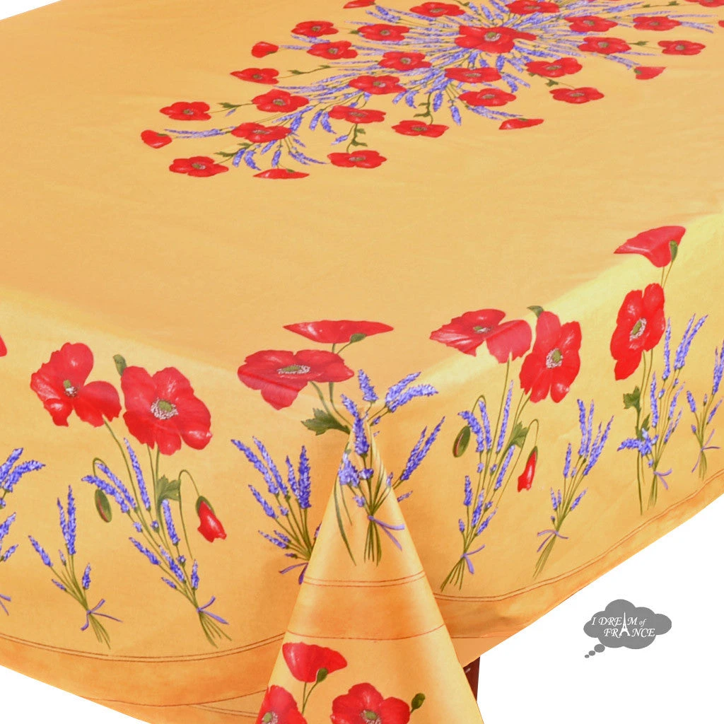 From Tissus Toselli, this coatedtablecloth features bright and cheerful poppy and lavender motifson a golden yellow background. It is 100% cotton coated with acrylicto makeit stain resistant and long lasting. Spills will not go through, protecting your table. Cleanup is as easy as wiping it with a sponge. UV resistant, they resist fadingand are perfect inside or outside.