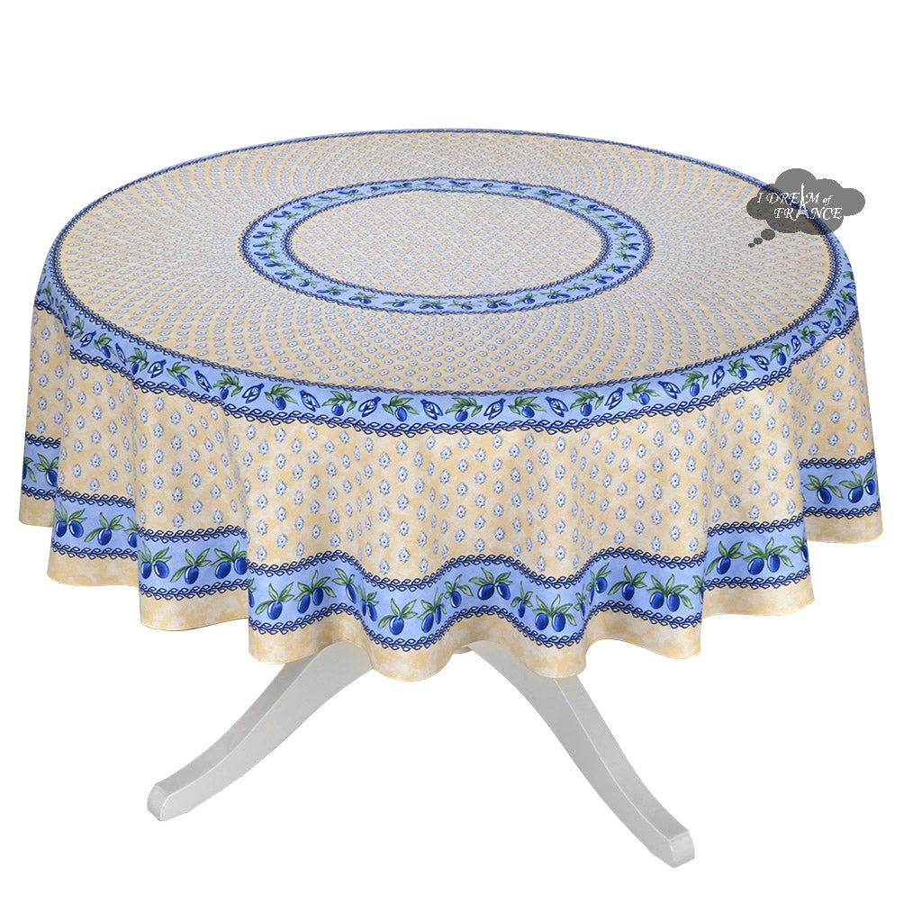 From Le Cluny French Country Collection, this coated tablecloth will transport your table to sunny Provence. It features flowers and olives on a beige and blue background. It is 100% cotton and is available with or without stain resistant coating.With the optional acrylic coating, spills will not go through, protecting your table.Cleanup is as easy as wiping it with a sponge. UV resistant, they will not fade and are perfect inside or outside. This tablecloth measures 70″ in diameter, it will fit most round tables up to about 52inches in diameter. Made in France. It can be ordered with an umbrella hole, please seeoptions below.