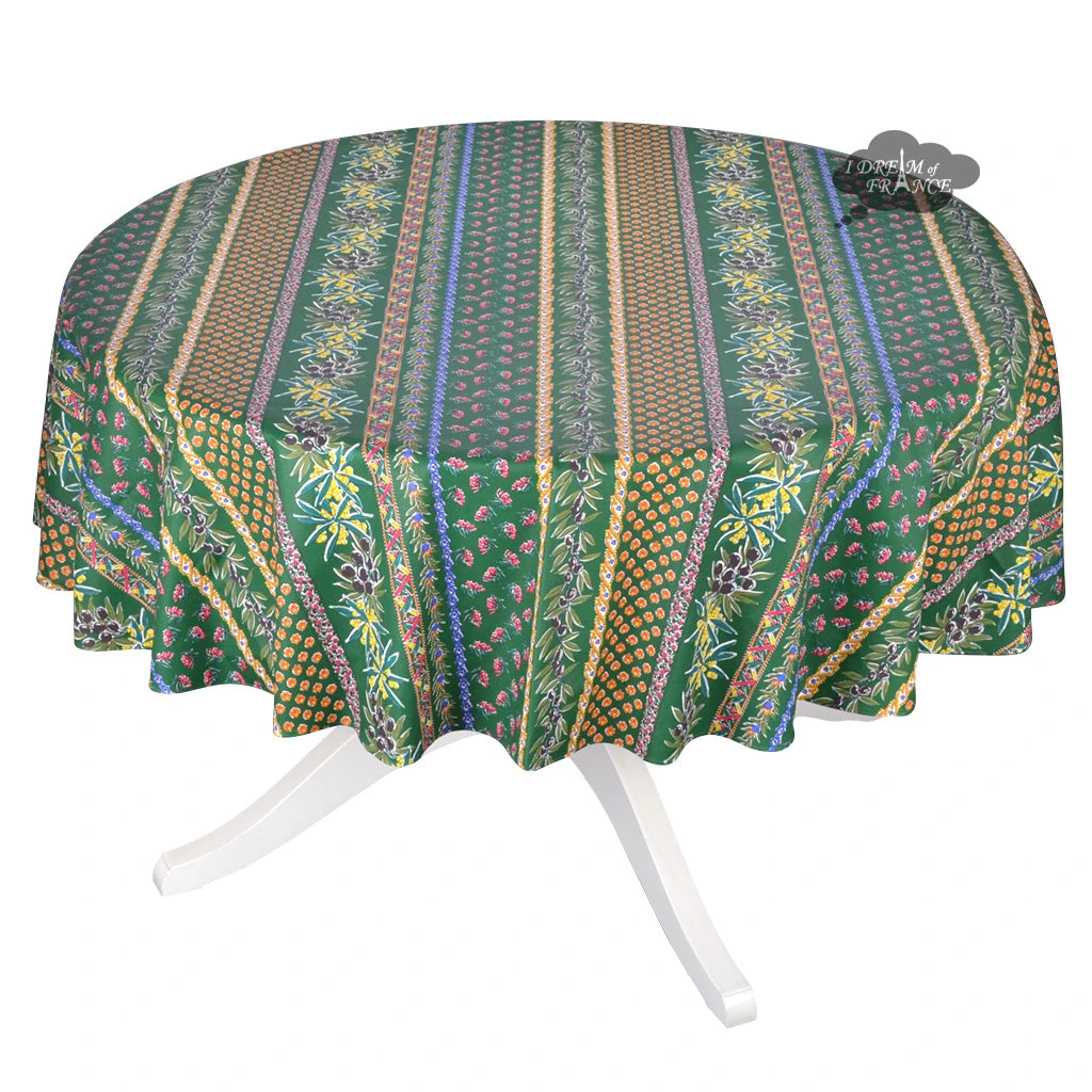 70″ Round Olives Green Striped Acrylic-Coated Cotton Provence Tablecloth By Le Cluny