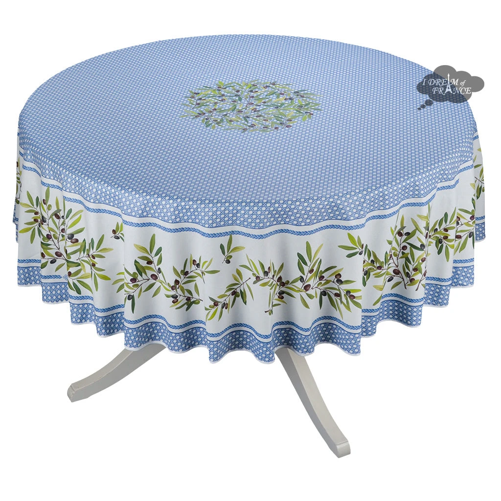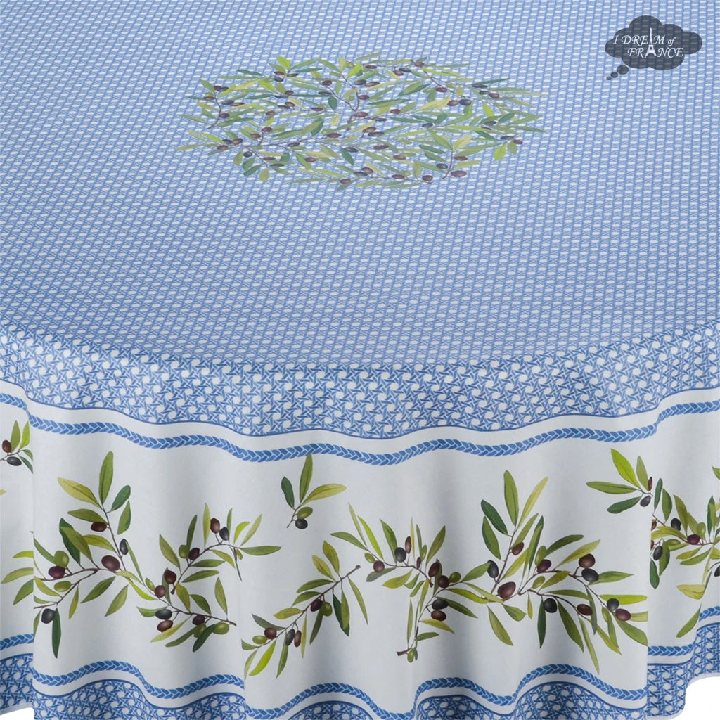 From Tissus Toselli, this coatedtablecloth is named after the picturesque town of Nyonsin the heart of Provence. It features a bright and cheerful olives motif on a blue and white background with a woven cane rattan pattern. It is 100% cotton coated with acrylicto makeit stain resistant and long lasting. Spills will not go through, protecting your table. Cleanup is as easy as wiping it with a sponge. UV resistant, they resist fadingand are perfect inside or outside.