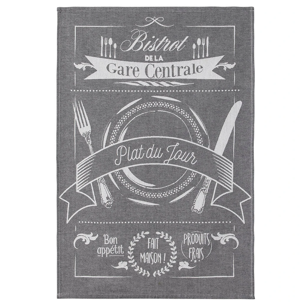 The Bon Apptitjacquard dish towel from Coucke will brighten your kitchen and your day.This towel measures 20″ x 30″ and features a detailed illustration woven into the towel of an ad for afictitious French restaurant named “Bistrot de la Gare Centrale”.Beautiful and soft, this towel will serve you well.