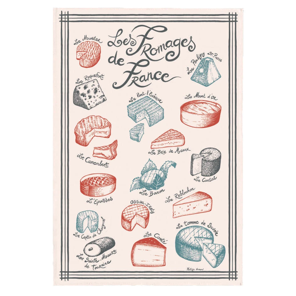 This Fromages de France (Cheeses of France) towel is not just a towel but a guide of delicious French cheeses. This tableau by Philippe Goron illustrates some of the most interesting cheeses you might discover on your next trip to France.
