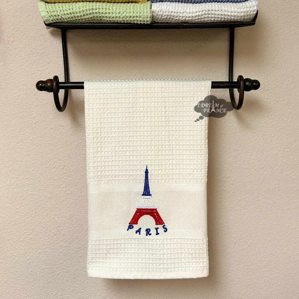 Direct from Paris, this beautiful towel will be a great addition to your kitchen. Made of 100% cotton, this Coton Blanc towel will handle the toughest jobs thanks to its waffle-weave texture. This creamcolor towel is embroidered witha blue white and red (the colors of France) Eiffel Tower.It comes rolled as on the picture, perfect for offering as a gift.