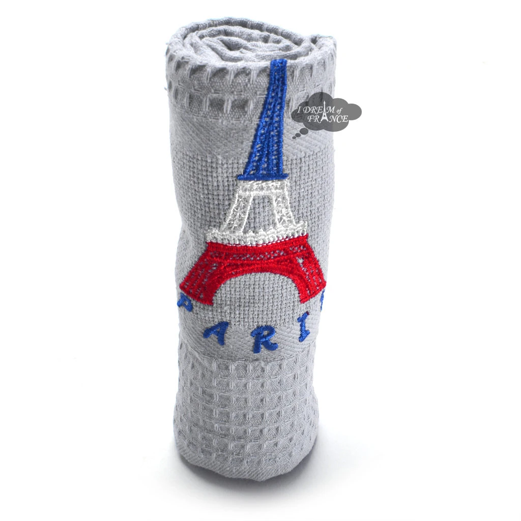 Direct from Paris, this beautiful towel will be a great addition to your kitchen. Made of 100% cotton, this Coton Blanc towel will handle the toughest jobs thanks to its waffle-weave texture. This gray towel is embroidered with a blue white and red (the colors of France) Eiffel Tower. It comes rolled as on the picture, perfect for offering as a gift.