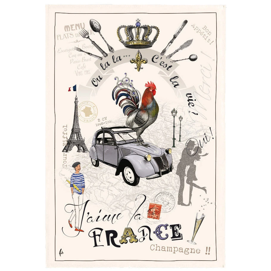 This France Panorama towel by Torchons &Bouchons embodies French culture and French life! The Eiffel tower, the Citroen 2CV, a couple kissing, a fleur de Lys, a rooster, “C’est la vie!”, are just some of the elements you will find on this lovely towel. Just like every Torchons et Bouchons towel, this towel is printed on heavy 100% cotton fabric using food safe dyes.