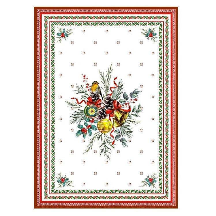 FromTissus Toselli, this cotton tea towel is a perfect addition to your Christmas dcor!The Joyeux Noltowel featuresa beautiful Christmas display of bells, bows, mistletoe, and other Christmas decorations.This towel measures 20×27″. Sold individually.