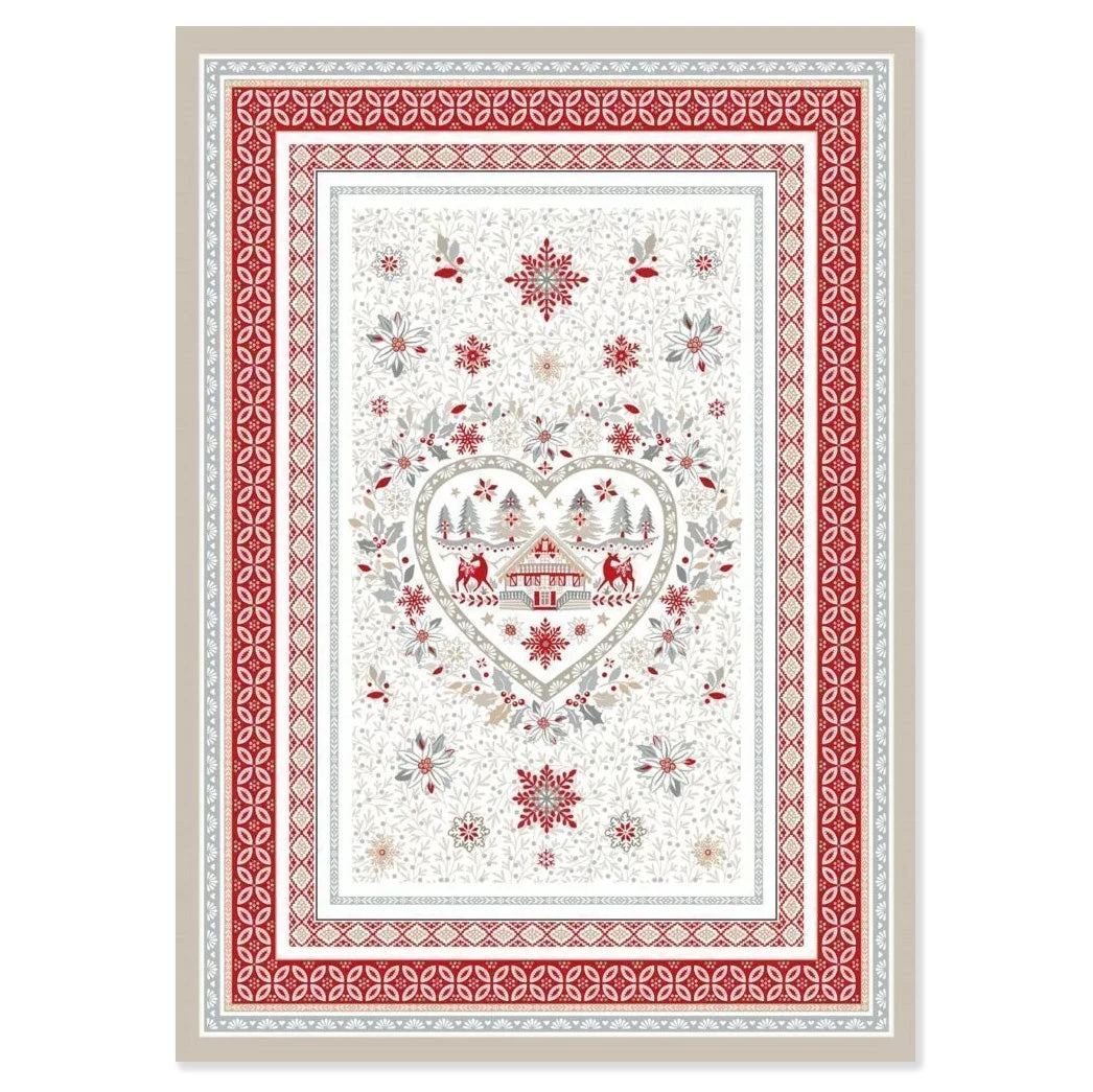 FromTissus Toselli, this cotton tea towel is a perfect addition to your Christmas dcor!The Mistletoetowel featuresa beautiful Christmas display with a heart in the center with a winter chalet and dears on the inside and mistletoe, snow flakes and other Christmas decorations surrounding it.This towel measures 20×27″. Sold individually.