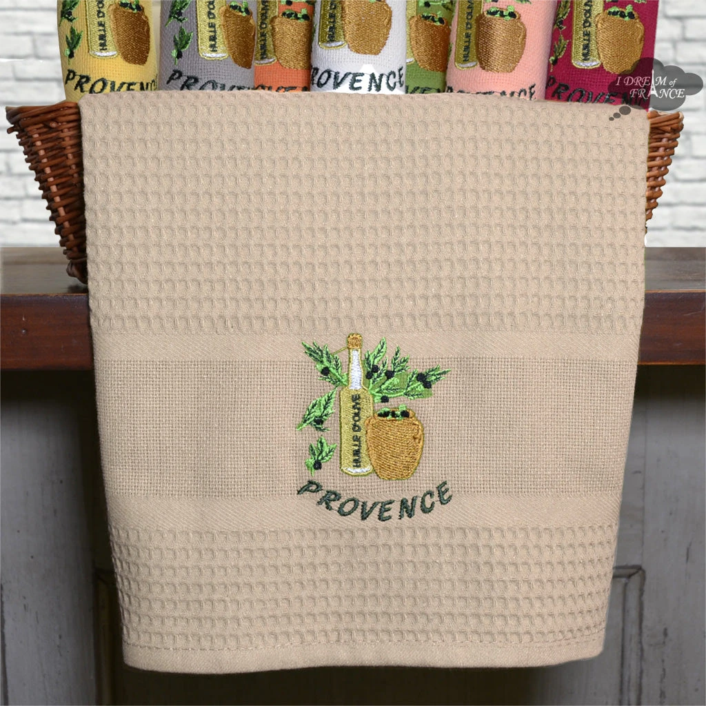 Direct from Provence, this beautiful towel will be a great addition to your kitchen. Made of 100% cotton, this Coton Blanc towel will handle the toughest jobs thanks to its waffle-weave texture. Thistaupe color towel is embroidered with olive branches, a jar filled with olives, a bottle of olive oil,and the word Provence. It comes rolled as on the picture, perfect for offering as a gift.