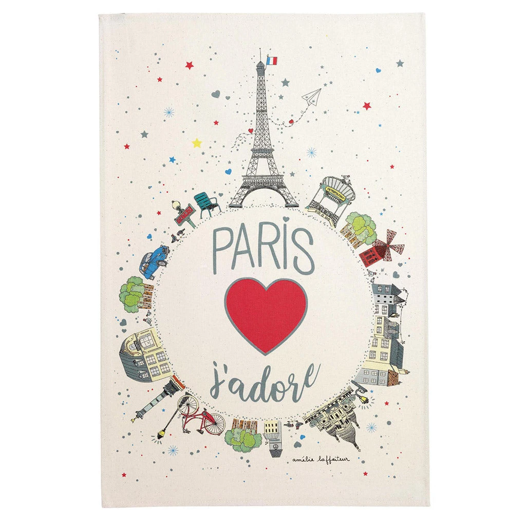 Paris is it’s own planeton this fun tea towel named Paris Planet. A red heart surrounded by “Paris J’adore” (Paris, I love) is inside the planet Paris with Parisian monuments and symbols on the surface. Illustration by Amlie Laffaiteur.