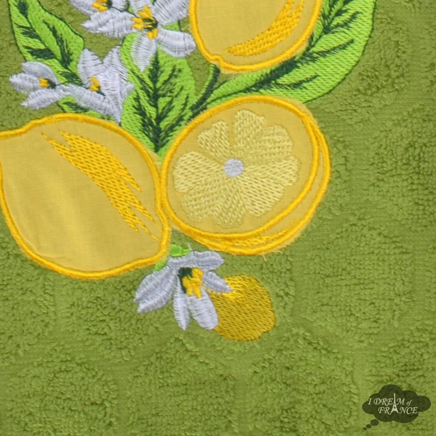 Direct from Provence, this hand towel is as beautiful as it is practical. In the kitchen or the bathroom, this round towel hangs from its center loop on the wall and offers a lot of surface area to dry your hands. This green towel with yellow binding features a honeycomb terry pattern and is embroidered with lemons. Measures 26″ in diameter. Designed in France, Made in Turkey.