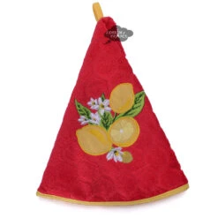 Direct from Provence, this hand towel is as beautiful as it is practical. In the kitchen or the bathroom, this round towel hangs from its center loop on the wall and offers a lot of surface area to dry your hands. Thisred towel with yellow binding features a honeycomb terry pattern and is embroidered with lemons. Measures 26″ in diameter. Designed in France, Made in Turkey.