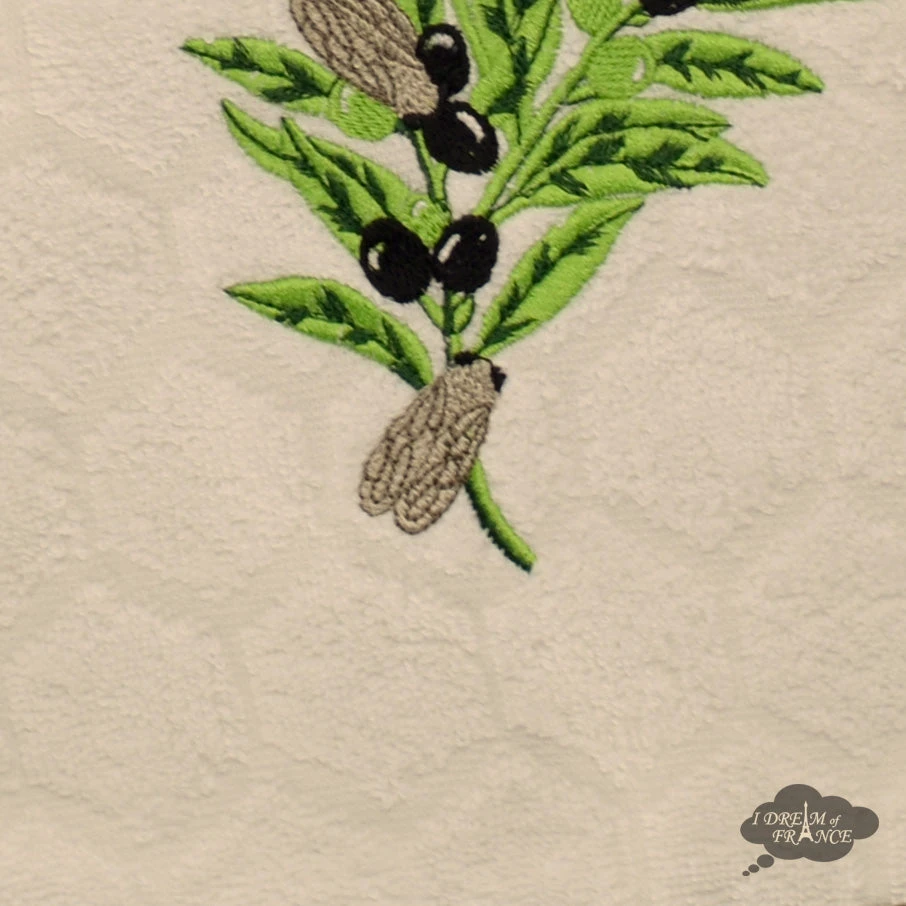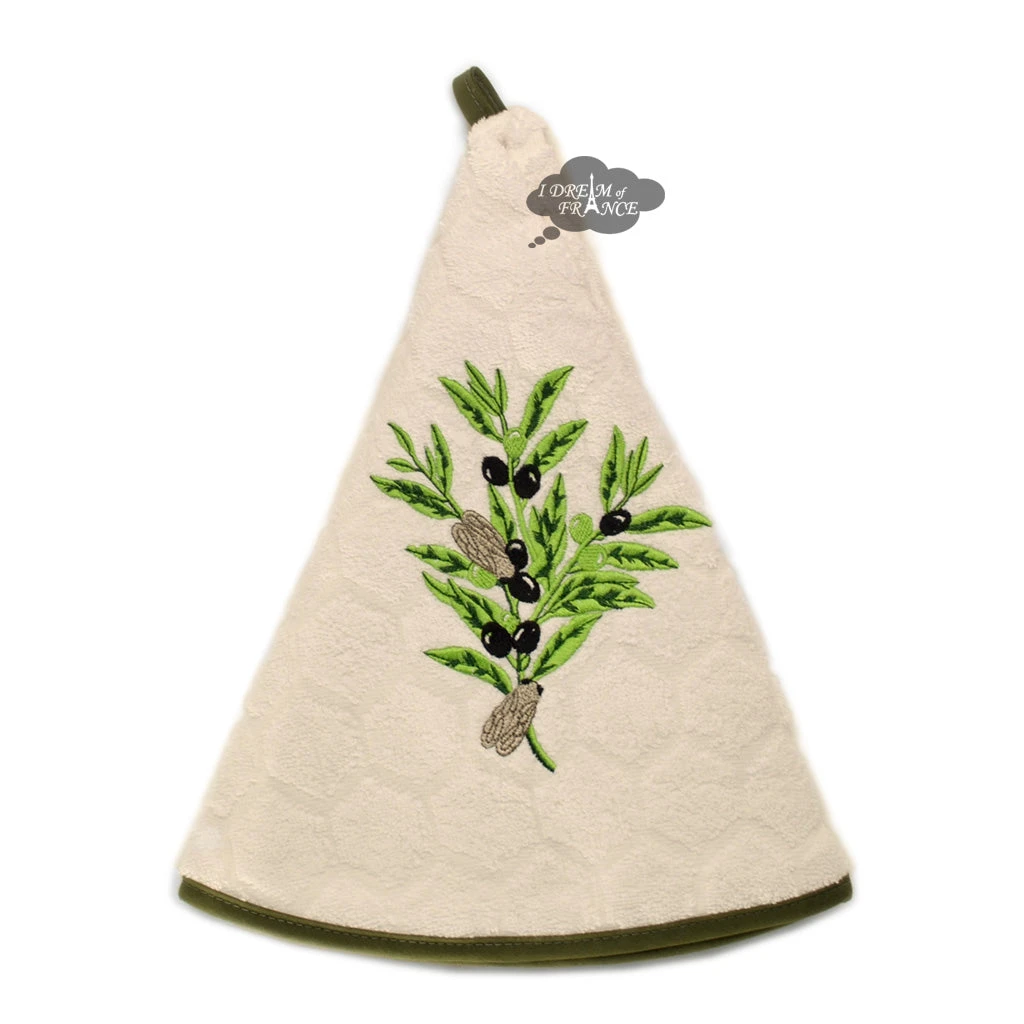 Direct from Provence, this hand towel is as beautiful as it is practical. In the kitchen or the bathroom, this round towel hangs from its center loop on the wall and offers a lot of surface area to dry your hands. Thisred towel with green binding features a honeycomb terry pattern and is embroidered with an olive branch and cicadas. Designed in France, Made in Turkey.